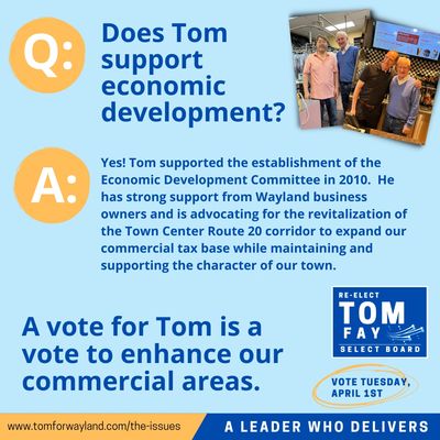 Looking ahead, an upcoming goal is revitalizing our Wayland Center Route 20 corridor, to expand our commercial tax base while maintaining and supporting the character of our town. With both of these projects, economic development done well is an important key to boosting tax revenues and lessening residents’ tax burdens.