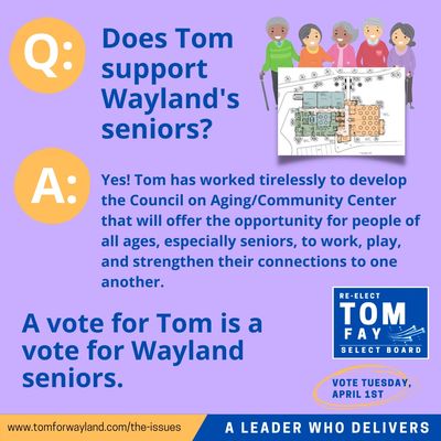 Council on Aging staff perform great work on a daily basis. They provide programs and outreach services that improve the quality of life and promote independent living for Wayland seniors. However, the amount of town space available for these services is woefully inadequate. I have worked hard to develop the Council on Aging Community Center that will offer the opportunity for people of all ages, especially seniors, to work, play, and strengthen their connections to one another.